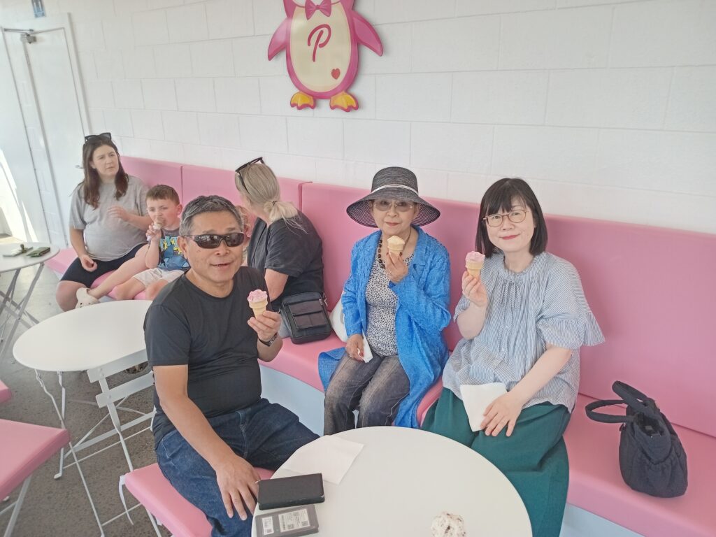 The couple opted to do separated activities (after the official visits organised by the Napier City Council and the obligatory Pan Pac visit) from the rest of the Tomakomai group, as they have visited Napier numerous times before, and Ms Kinuko Iko, of the Japan Society offered to accommodate the Akagawa’s during their two-night stay in Napier. I (Iain) acted as chaperon and drove them to various destinations. It was a good chance to catch-up and practice both languages in a relaxing manor. This opportunity was good exposure for Japan Society, as Mr Akagawa was also the president of the New Zealand Friendship Society. Some of the sites we visited were the Centennial Garden Waterfalls, the Bluff Hill look out and the Ahuriri waterfront. It was a hot day, so I treated them to ice cream in Pandora. Tomakomai people love ice cream.